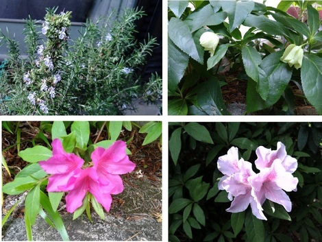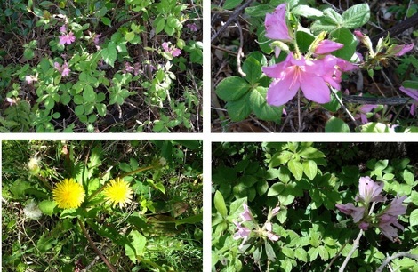 上段は行きの「歩道」脇に咲いていました「つつじ」で、下段は下池の横で撮りました「たんぽぽ」と「つつじ」です。