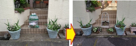 そして、ふーたんが「(花が散って)道路に散らばる!」と申しますので、「葉牡丹」も下の写真のごとく根元の少し上からチョキンして袋に入れまして「集積場所」へ出しに行ってまいりましたヨ!