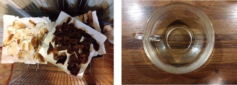 その花びらを娘は「乾燥(下の左写真)」しまして今日、「木蓮茶(右写真)」を作ってくれました。