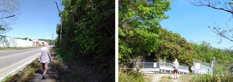 左下は用水に掛かっています「橋」の手前で、右上は帰り道の脇道から「歩道」へ出たところです。