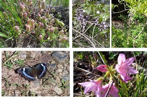 左下は用水手前でパチリしました「ルリタテハ(蝶)」で、右下は「上池のつつじ」です。