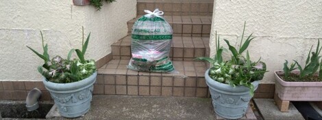 4月16日の「グリーンベルトの草取り(掃除)」で刈り取りました「げんこつ」などの草も一緒に、「市の指定可燃ごみビニール袋(下の階段の袋)」に入れました。