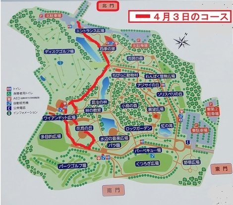 午後3時35分から4時15分まで、下の地図内の「赤線のコース(「北門の駐車場→四季の家の横のメイン道路→ワイアンドット広場→花見の丘」)」を参りまして、「ワイアンドット広場・花見の丘」でゆっくりと「お花見」を・・・!
