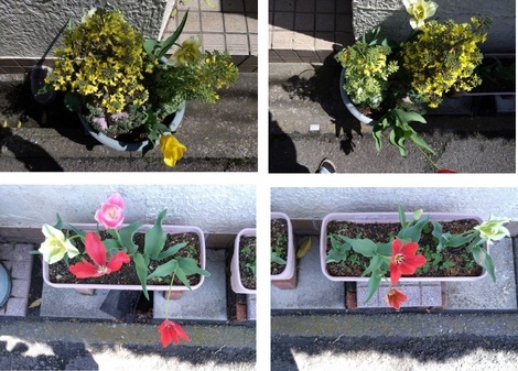 まずは、玄関の「チューリップ」ですが、「黄色い花」の次は「赤い花」、そして「白い花」も咲いてまいりました。