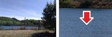 下の2枚の写真は「中池」で、池もには「鴨(かも:右写真の矢印)」が・・・