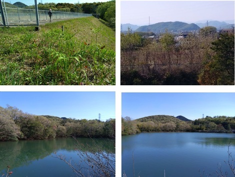 下の写真は「中池一周」で、左上は中池手前の「用水の側道(「わらいび」が生えていました)」で、右上は側道からの「伊木山」です。