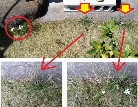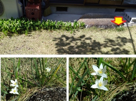 下の写真はキッチンステップ前の「アマナ」ですが、写真の左端の「丸印」は昨日のトピックにアップしましたが、右端の「矢印」のごとく石のステップの東側に「2株」見つけましたヨ!