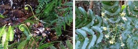 その近くに「シダの芽(下の左写真)」が、帰り道では「ヒイラギナンテン(下の右写真)」が。。。