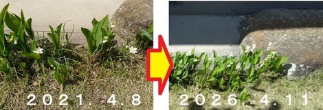 かつては下の左写真のように、石の左側にも「あまな」がありましたが、「すずらん」が進出しまして、今は右写真のごとく「すずらん」だけになってしまいました!(T_T)