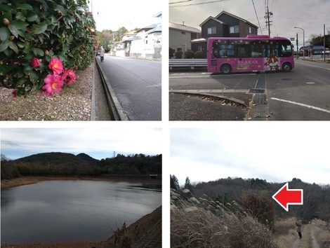 (下の左上写真はお散歩に出かけてすぐのところの「グリーンベルト(山茶花が・・・)」で、右上はお隣団地出入口で会いました「コミュニティバス」です。