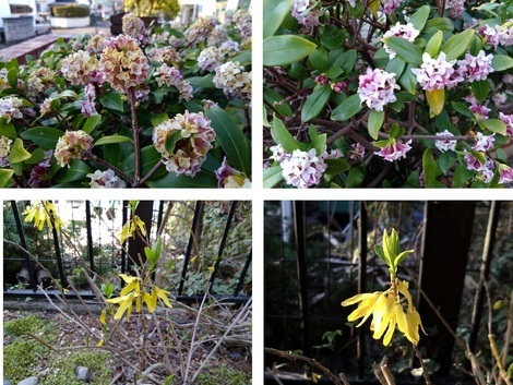 (下の写真は今日パチリしました玄関の「沈丁花(枯れかけと満開)」と「レンギョレンギョウ(連翹)」です)