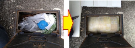 ふたを開けますと下の左写真のごとく、昨年(かな?)の「凍結対策」がしてありました。