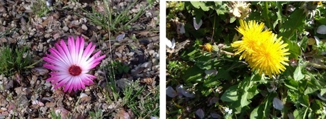 下の左写真は「花見の丘」の花壇で咲いていました「リビングストンデージー(だと思います)」で、右は帰り道でパチリしました「たんぽぽ」です。