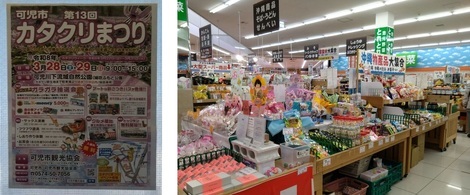 (下の写真は「カタクリまつり」のポスターと市場内の「沖縄コーナー」です)