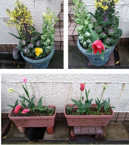 帰宅しますと玄関先では「チューリップ・葉ボタン」が「お帰りなさい」と・・・ほんまかいな!?^_^