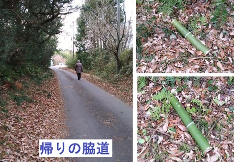 下の写真は帰りの「脇道」で、「2本の青竹」が脇道の脇に・・・もったいないような!