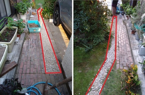 (下の右写真のごとく、以前に「庭」に敷きました「砂利」と連結しましたので、おそらく「へこんだ庭の水たまりは解消」されるのでは?と期待しております\(^_^)/