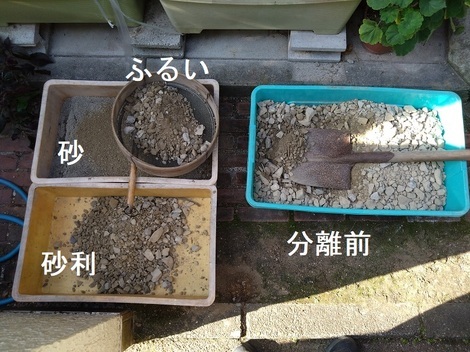 まず最初に、砂利を「ふるい」に掛けまして「砂」を別のパン箱に分けました。