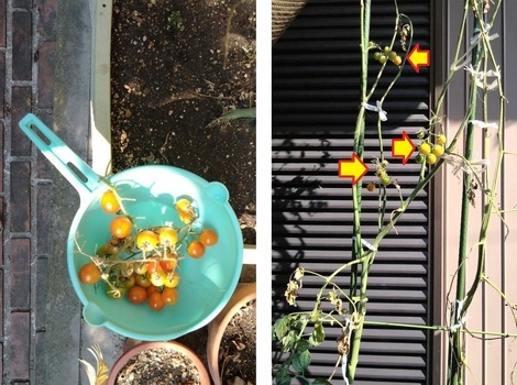 そこで、色がついていますミニトマトを「収穫(下の左写真)」することにしました。