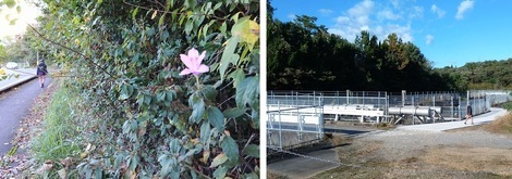 下の左写真は行きの歩道ですが「つつじの返り咲き」が、右写真は中池から用水の側道を少し北へ、ふーたん「むかご」採りでございます\(^_^)/