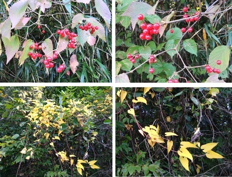 下は行き帰りの歩道での写真で上段は「ガマズミの実」で下段は「自然薯の紅葉した葉」です。