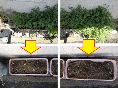 玄関前の「プランター(2鉢)」にも、「スベリヒユ(左写真)」が元気よく生えていましたので、抜きました。