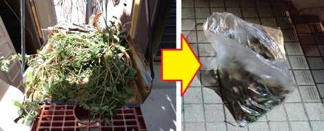 昨日、庭のプランターにニョキニョキと生えています「スベリヒユ(下の左写真)」を塵取りに入れました。