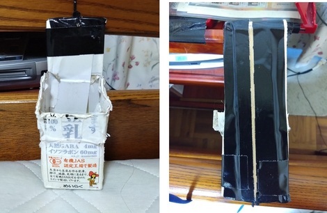 下の写真は「補強後」でございまして、左写真が「牛乳パックの表」で、右写真が「裏」ですが「裏」には補強のために「ベニヤ板」を「ガムテープ」で牛乳パックの裏面に張り付けました。