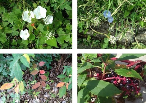 下の上段写真は「アサガオとニラの花」で、左下は行きの歩道で撮りました「紅葉」右下は帰りの用水端の脇にあります「ヨウシュヤマゴボウ」です。