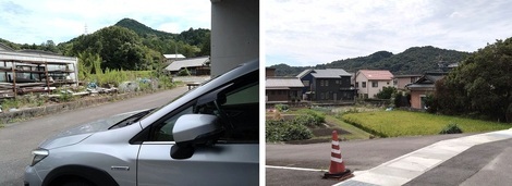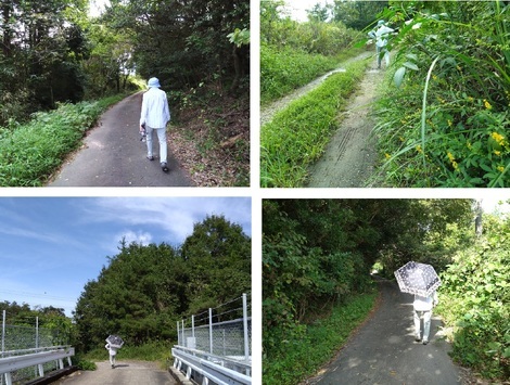 下の上段写真は「お散歩の行き(脇道・Y字路)」で、下段が「帰り道(用水の橋・脇道)」です。