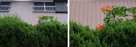 ふーたんが「垂れているツルを取ってよね!」と申しますので、下の左写真のごとく垂れています「ツルの掃除」と西の庭にもウネウネと這いずっています「つる植物」をむしり取りまして、「雑草」も取りました。