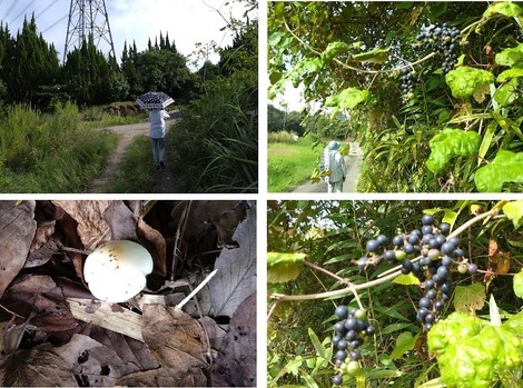 左下は行きの歩道で撮りました「きのこ」で、右下は帰りの迂回コースでの「山ぶどう」です。