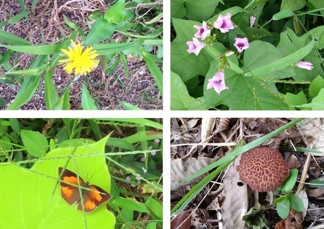左下の蝶は「ウラギンシジミ」で、右下のキノコは「キクバナイグチ」です。