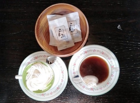ふーたんは「抹茶ラテ(下の写真の左側)」で、私は「紅茶(ふーたんから「ラテ」を少し貰いましたヨ!)」でございました。