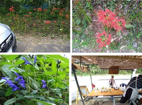 「ブドウ販売所」でも「彼岸花」が・・・左下の花は「メドーセージ」のようです)