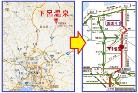 ・まずは下呂温泉の場所ですが「岐阜県下呂市」でして、「国道41号線(下の右地図の赤線:名古屋~富山)」を「北上(高山・富山方面)」します。