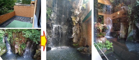 真ん中と右の写真は「1階のロビー」からの「滝」です。