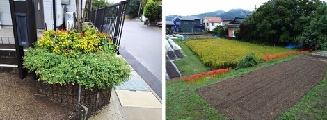 下の左写真は息子宅の「玄関花壇」、右写真は息子宅の西側のあぜ道の「彼岸花」です)