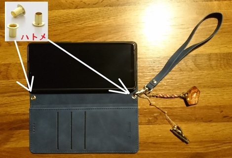 実は通販で買いました新しいスマホケールには下の写真のような「ハトメ」がありませんので、いつもご相談に乗って頂いている店員さんに「取り付ける相談」をしました。店員さんに新しいスマホケースをお見せして「古いケースと同様に”ハトメ(下の写真)”を付けたいのですが?」と相談しますと「ハトメを付ける器具が約1千円、穴あけ具も必要ですか?」ということで買うのを諦めました。