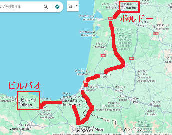 3本目の「自転車旅 ユーロヴェロ90000キロ バスク地方からフランスの美しい村へ」では、下の地図のごとく「ビルバオ(スペイン)」から「ボルドー(フランス」までの自転車の旅でした。