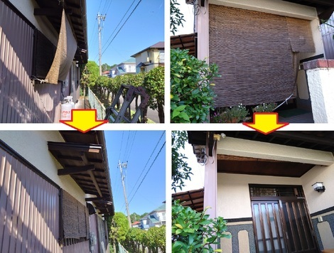 「日よけ」、今年はキッチン東窓と玄関の2か所だけ(下の写真)で、いつもの南の部屋の3か所は日よけをしませんでした。
