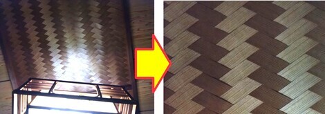 『網代天井(あじろてんじょう)とは、木、竹、草などを薄く加工して網状に編んだものを天井材としたものです。