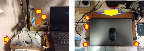 右写真の矢印のごとく、「各種ケーブル端子がPC本体の左右」にありそのケーブルが「曲線」を描いて接続元へつながっていますので「曲線部分が邪魔」になります。