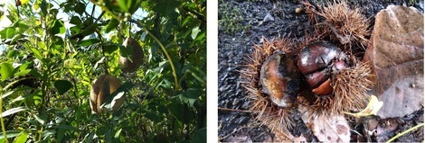 (下の左写真は行きの合流地点からショートコースへの途中の「アケビ」で、右写真は帰りの歩道の「栗」ですが「腐っている」ので誰も見向きもしないようです。