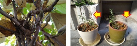 (「ローズマリーの挿し木」は「6本中2本(下の矢印)」が枯れてしまったようです。