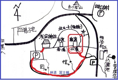 今日の「登山ルート」は下の地図の「赤線」のごとく、4回のお散歩コースの延長でございます。