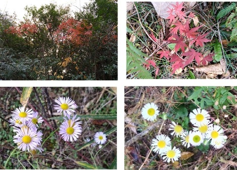下段写真はお散歩の帰り、左下は行きと「同じもみじ」で、右下はグリーンベルトに咲きだしてまいりました「山茶花(さざんか)」です。