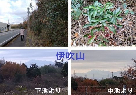 下の上段はお散歩の行きで左上はいつもの「歩道」、右上は歩道脇の「万両」です。