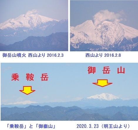 下段写真は我が町の隣の「岐阜県各務原市と関市」の間にあります「明王山」山頂からの「乗鞍岳(3026m:北アルプスの南端)」と「御嶽山」です。