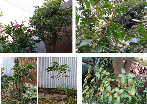 上段写真は「山茶花(さざんか)と柊(ひいらぎ)」で、下段は「2本の万両」とカーポート横の「千両」でございます)